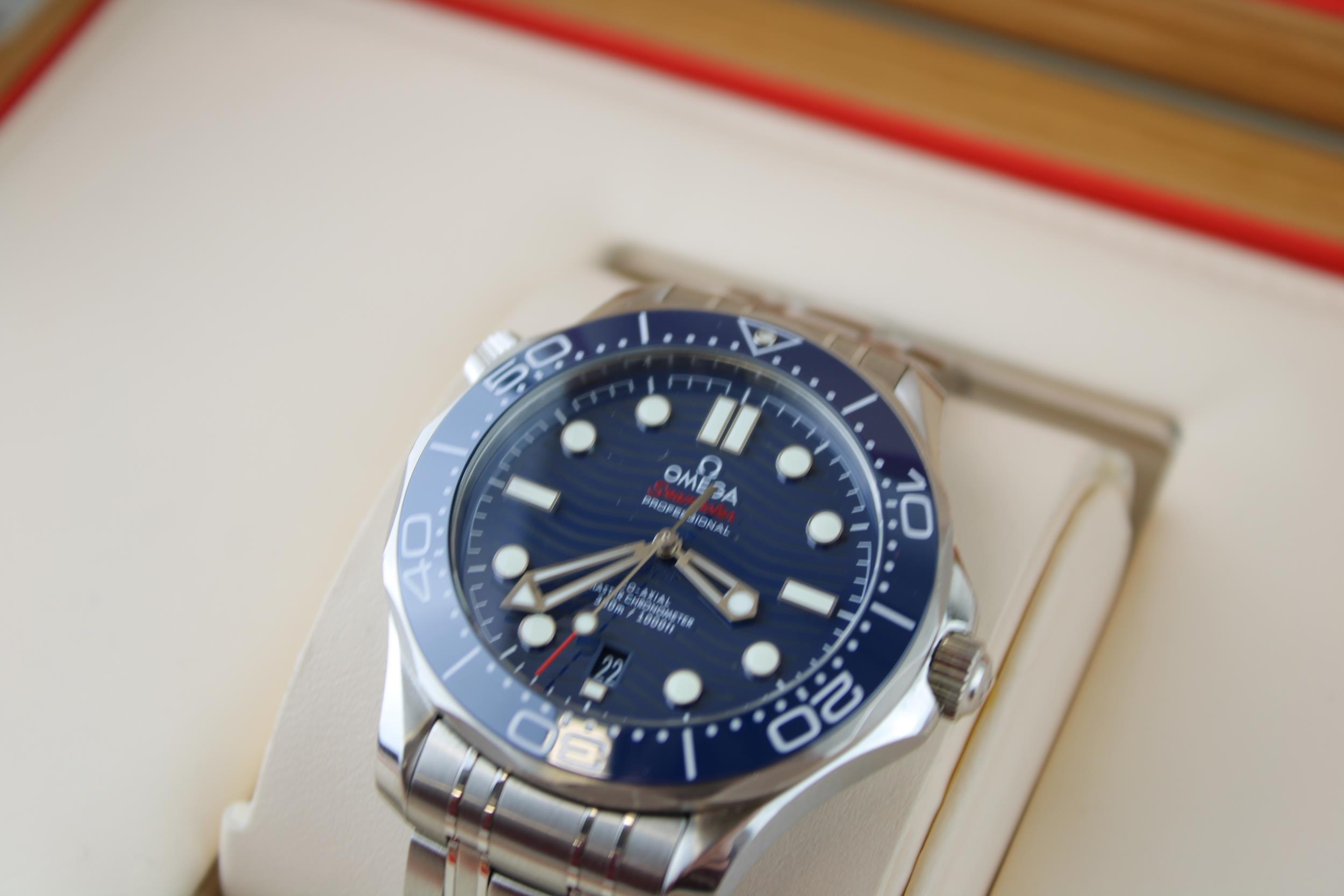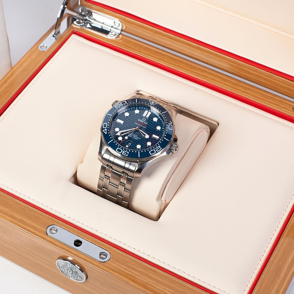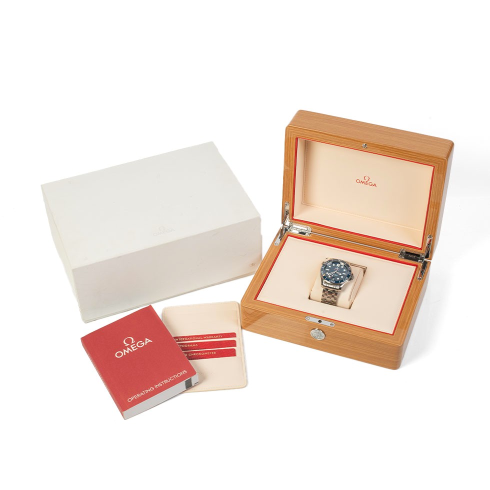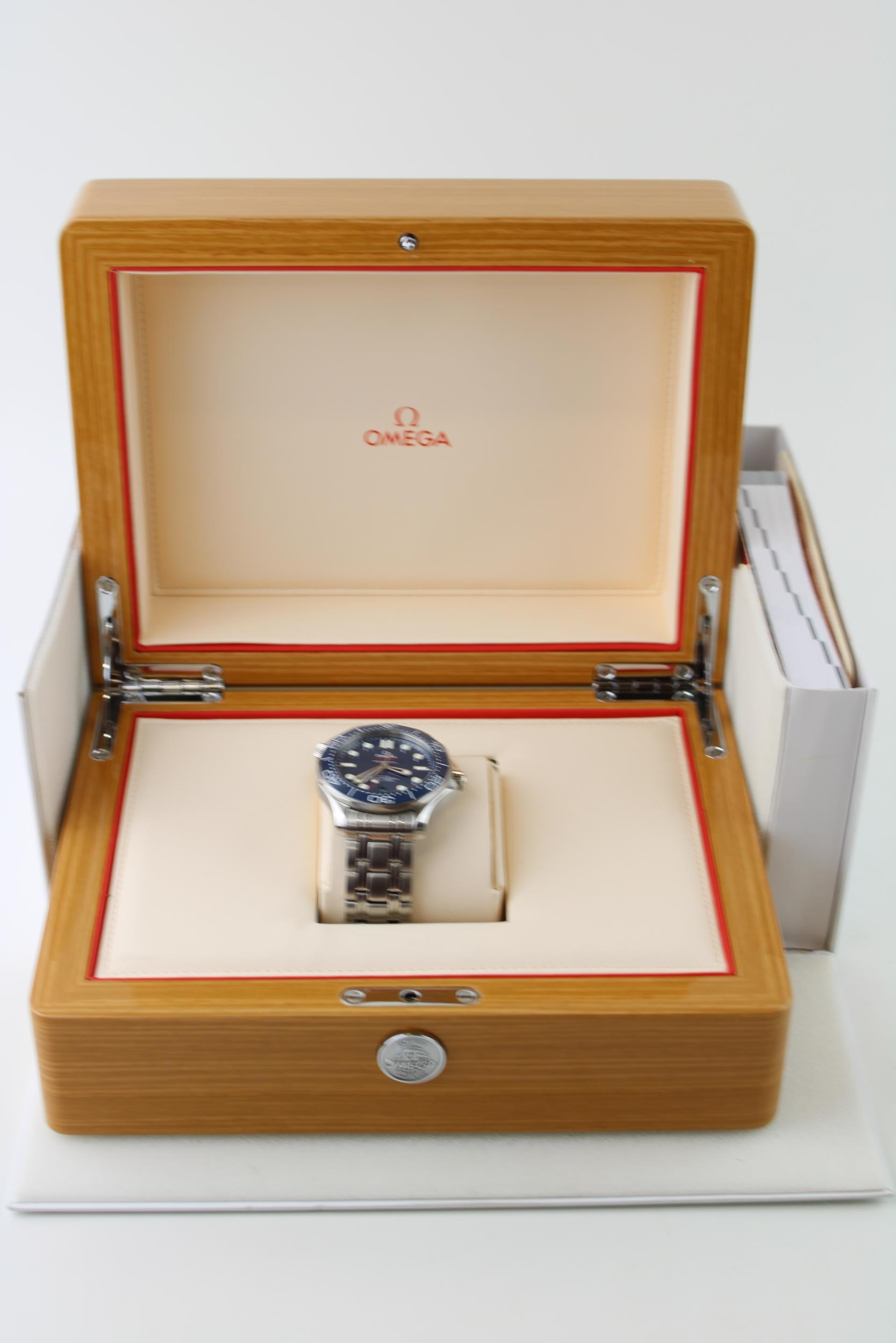 A gentleman`s Omega Seamaster Diver 300 REF 21030422003001Calibre No. 8800 Watch No. 89826766. 2019. Master Chronometer automatic calendar movement. Sweep centre seconds. Blue dial with luminous hour markers, date aperture at six. Stainless steel case fitted to a stainless steel bracelet folding clasp. Sapphire crystal glass. Together with instructions, warranty booklet, wooden Omega presentation box and white Omega outer box. Case diameter 42mm.