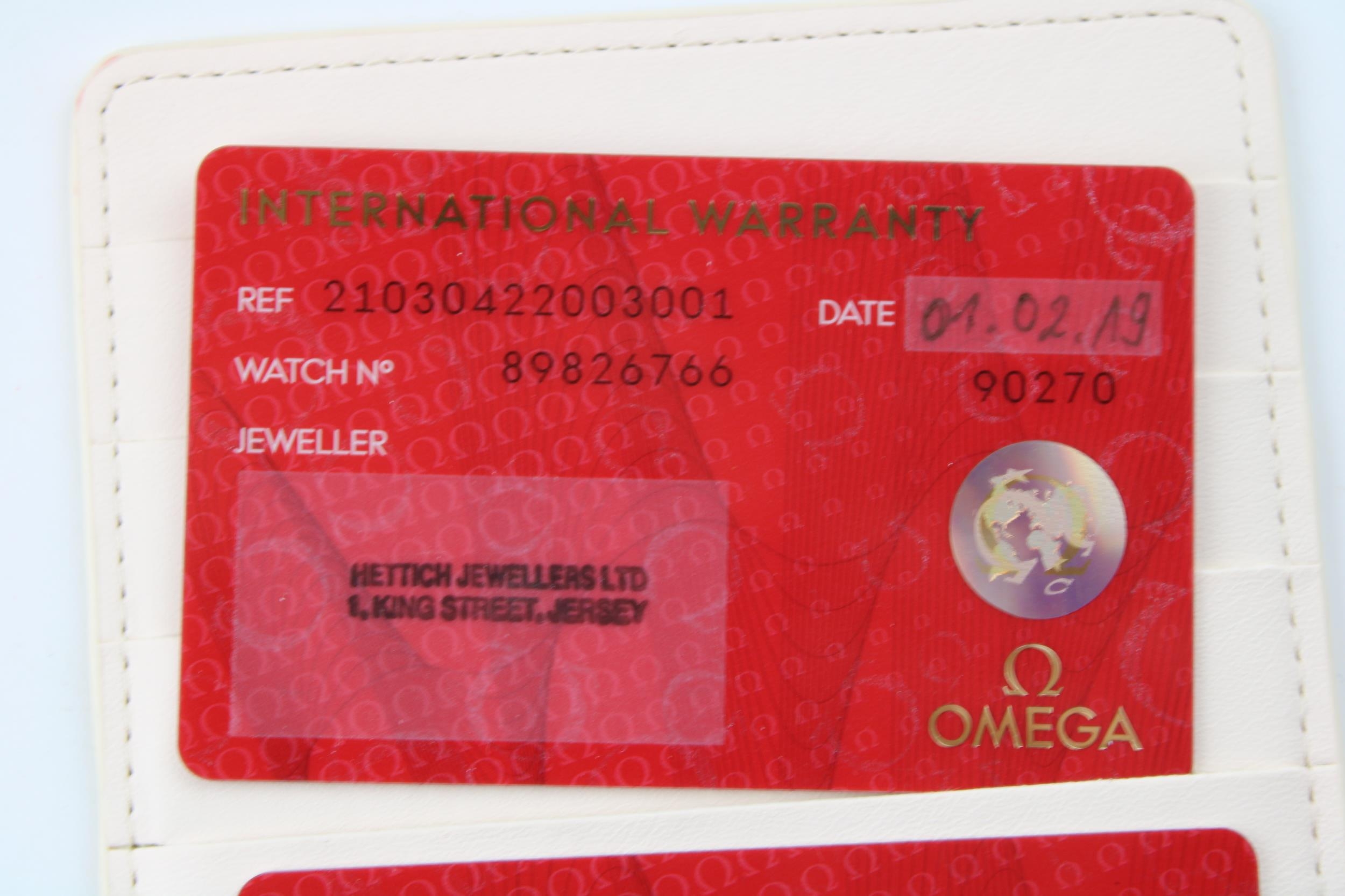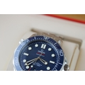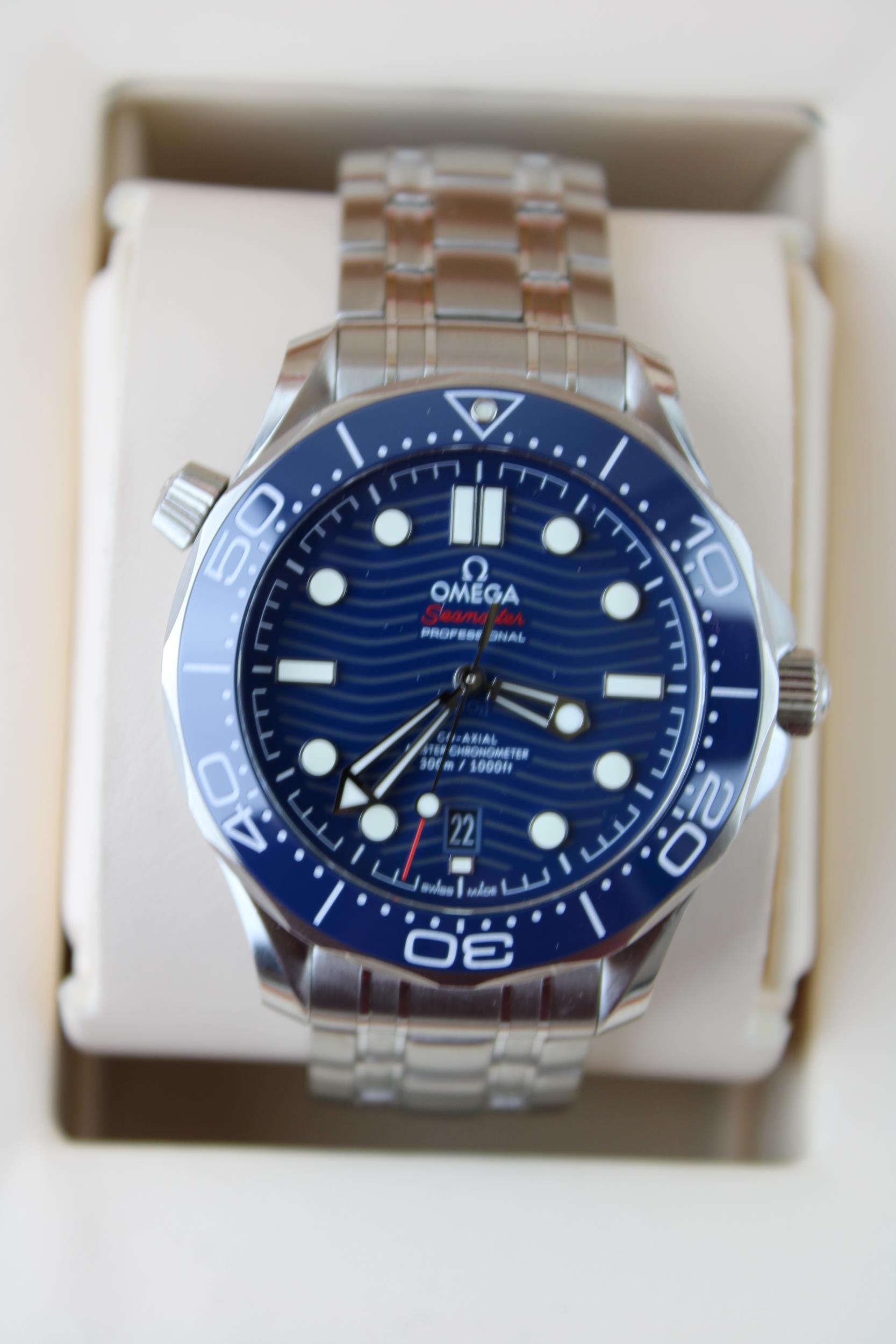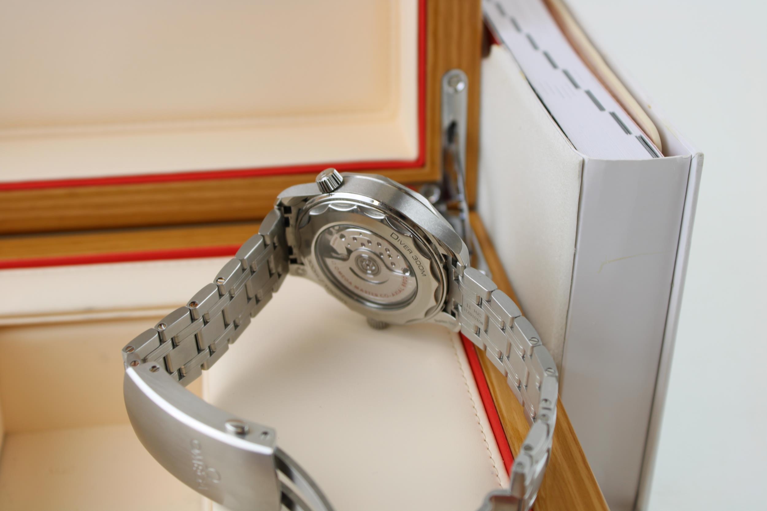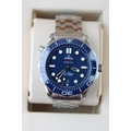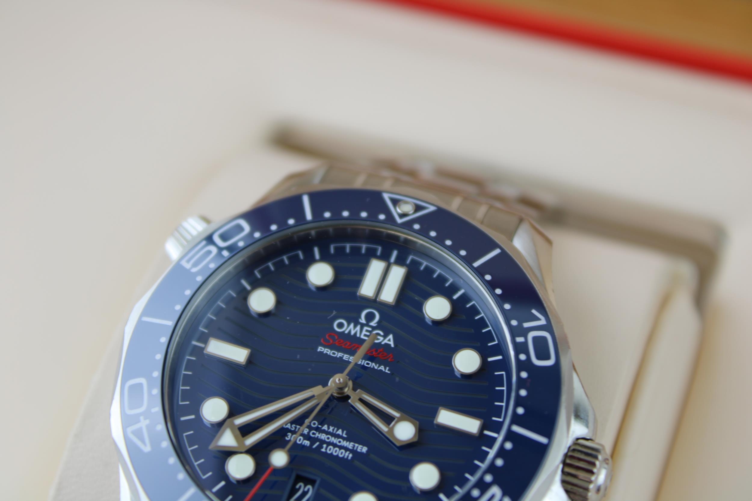 A gentleman`s Omega Seamaster Diver 300 REF 21030422003001Calibre No. 8800 Watch No. 89826766. 2019. Master Chronometer automatic calendar movement. Sweep centre seconds. Blue dial with luminous hour markers, date aperture at six. Stainless steel case fitted to a stainless steel bracelet folding clasp. Sapphire crystal glass. Together with instructions, warranty booklet, wooden Omega presentation box and white Omega outer box. Case diameter 42mm.