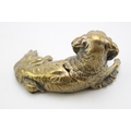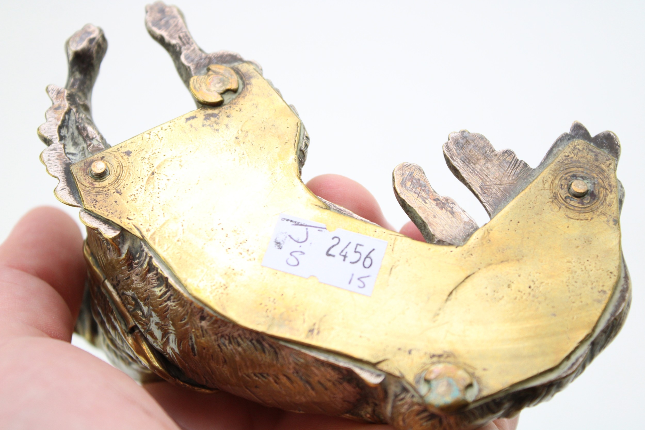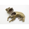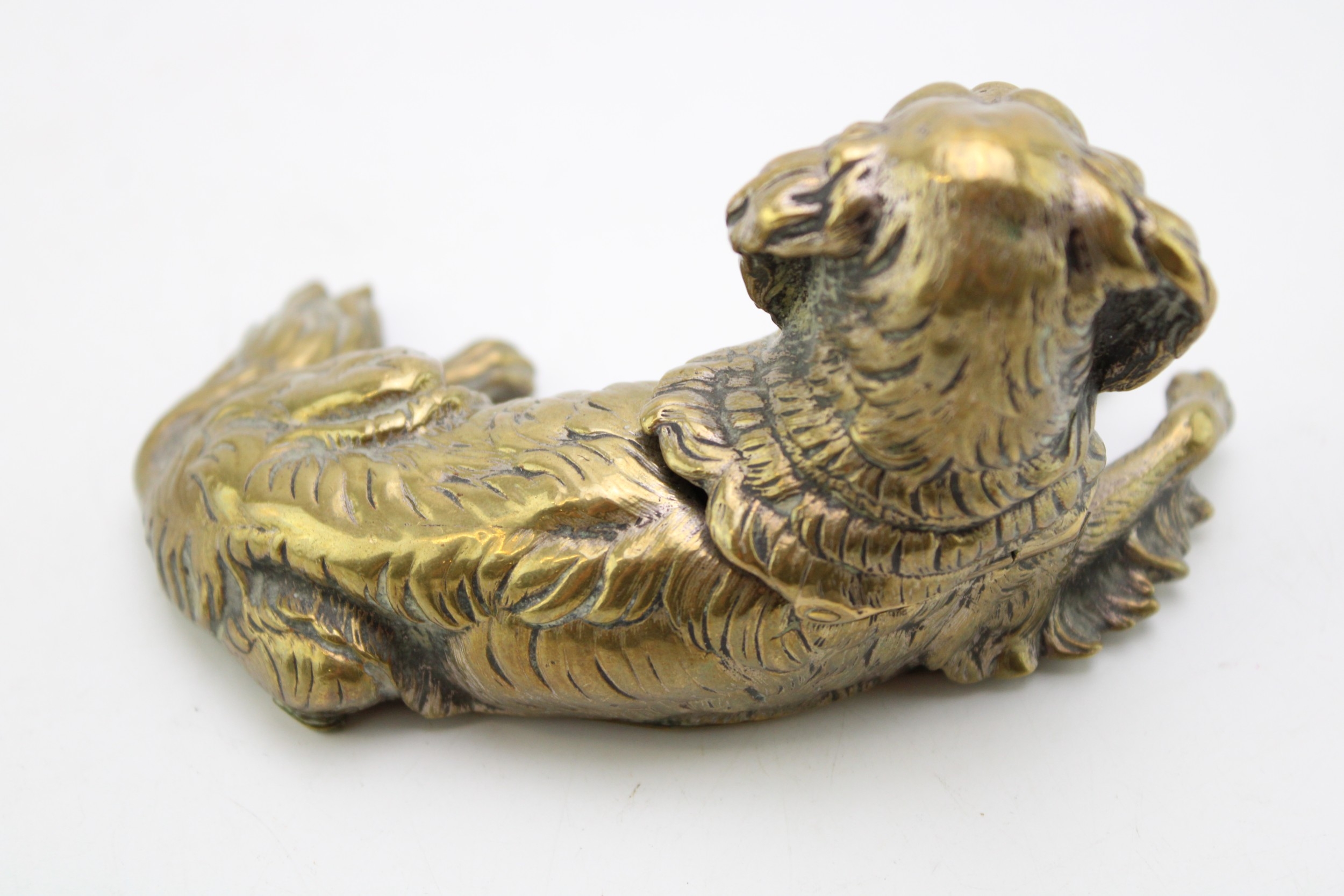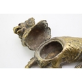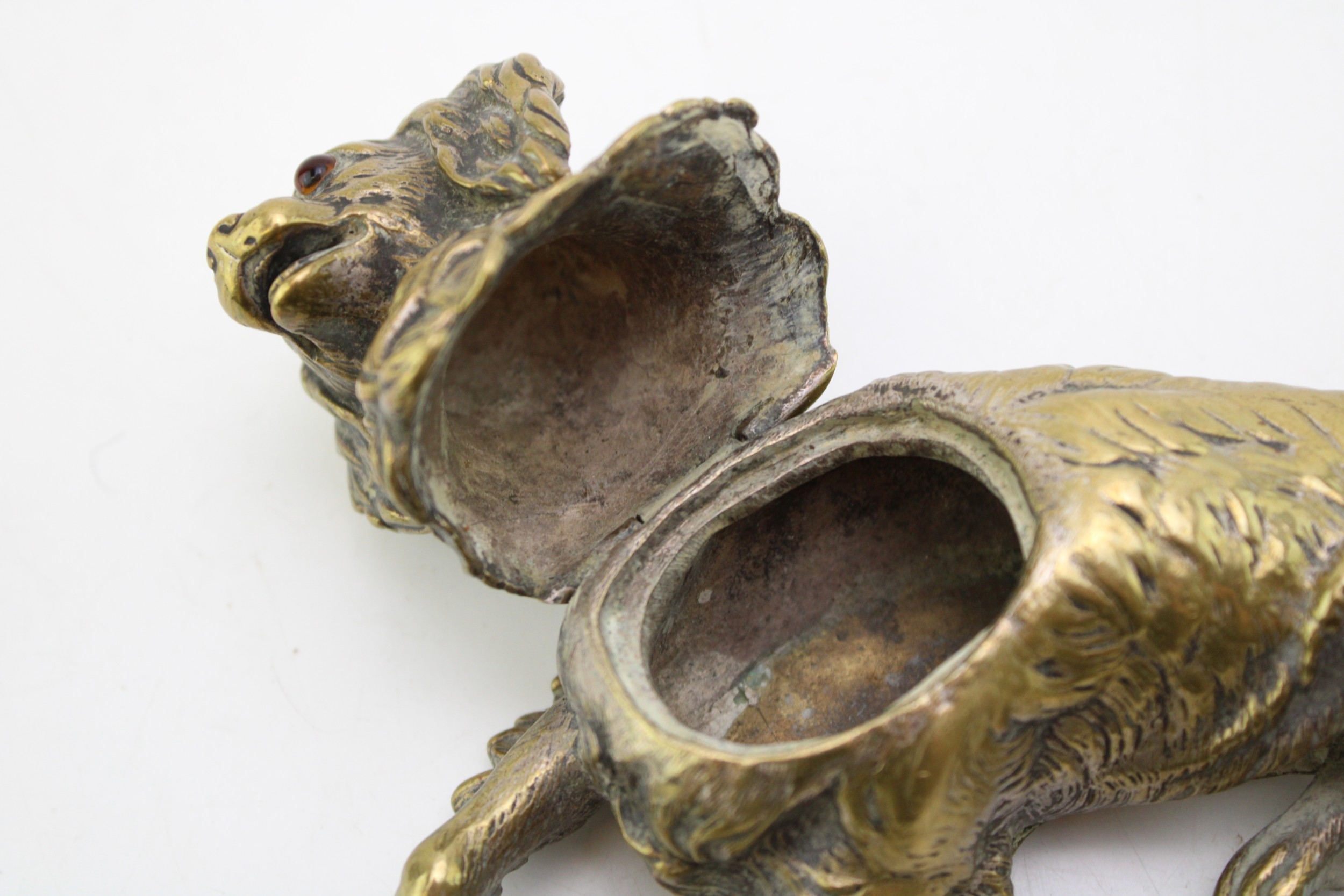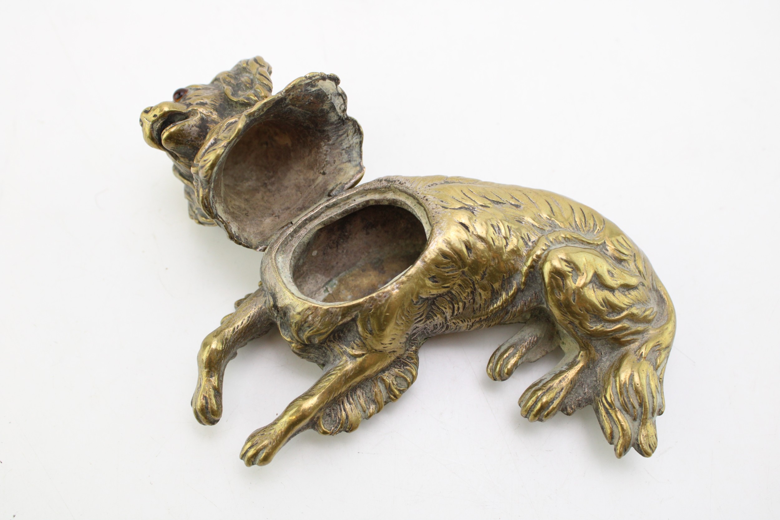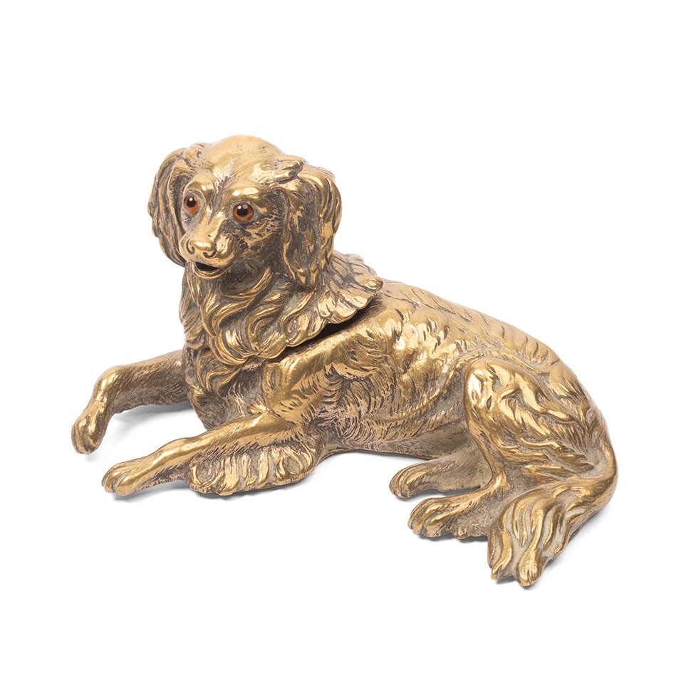 A late c19th Victorian brass inkwell in the form of a spaniel dog with glass eyes with hinged head