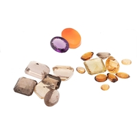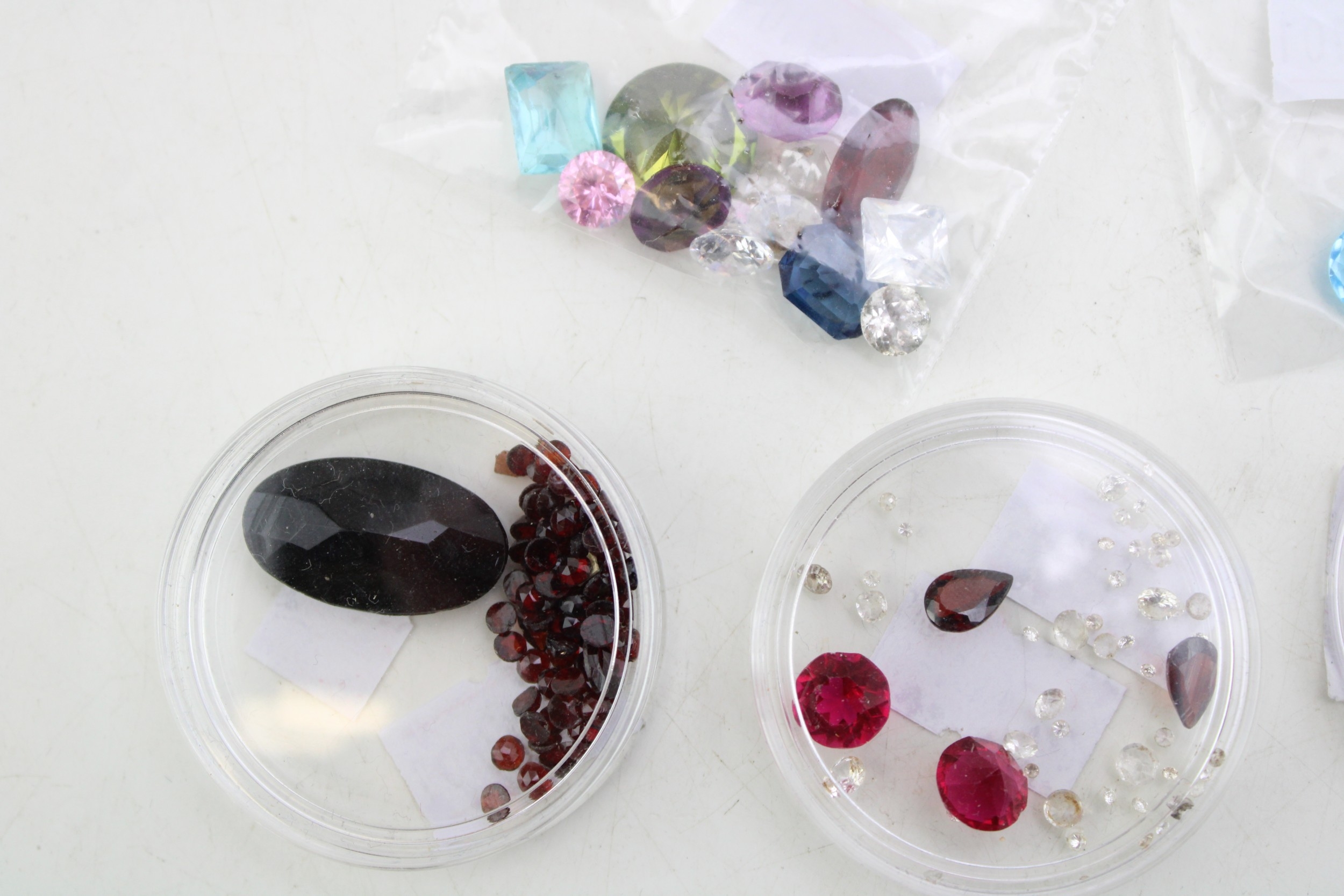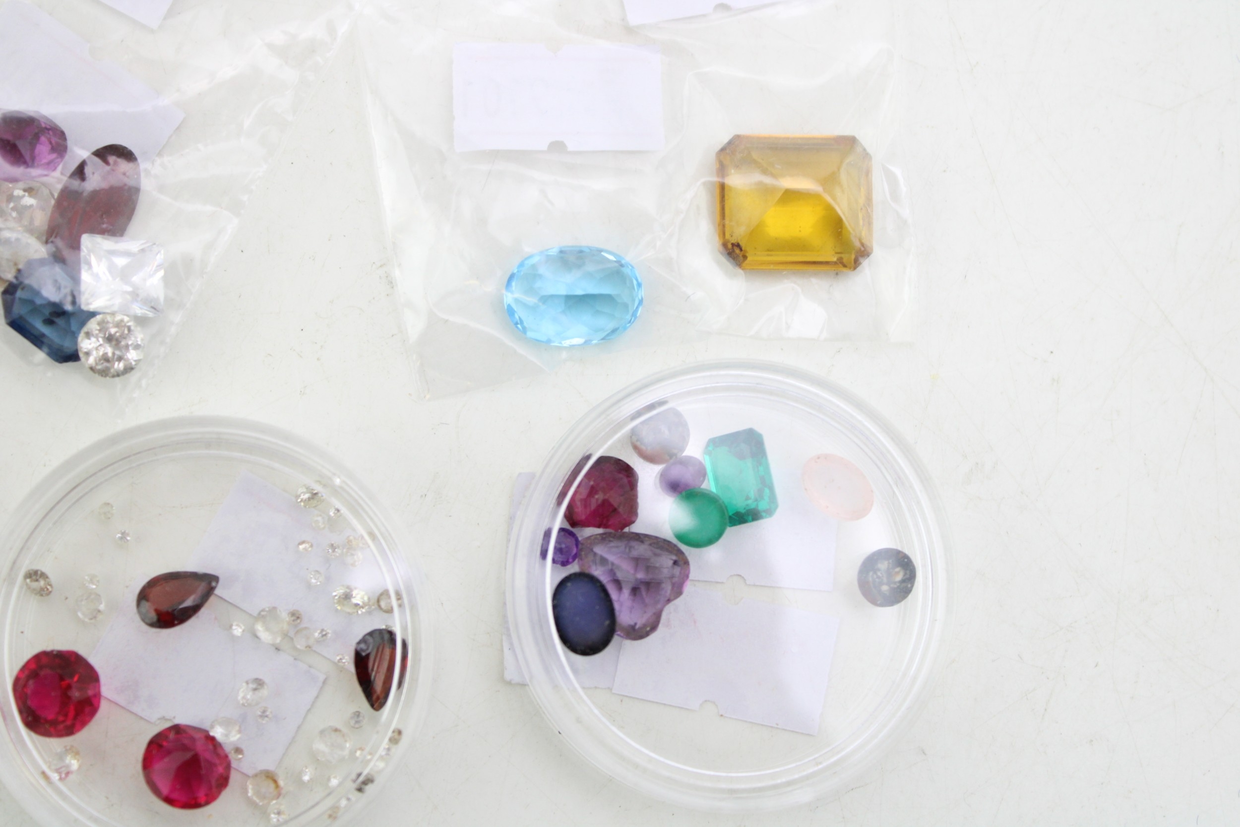 A group of vintage loose gemstones, including garnets, tourmaline, heart cut amethyst, topaz, agate and paste.