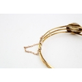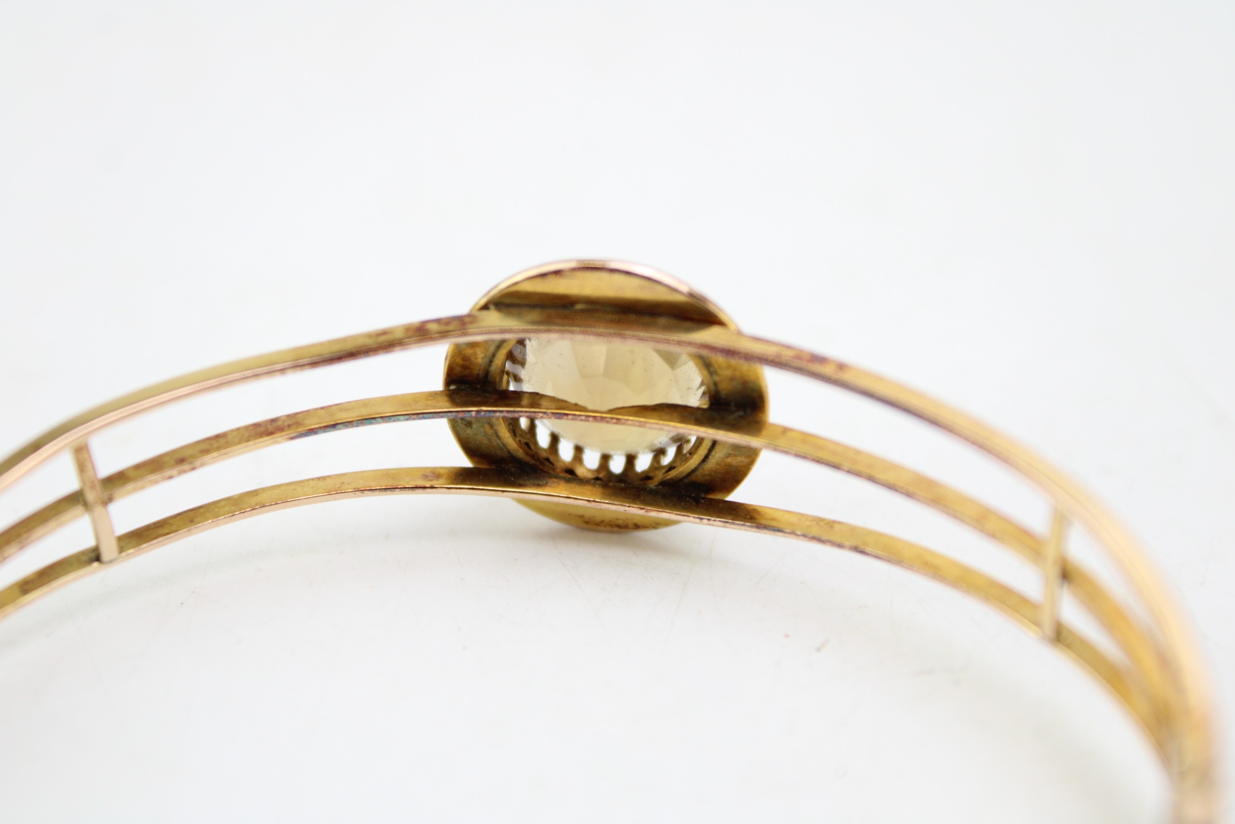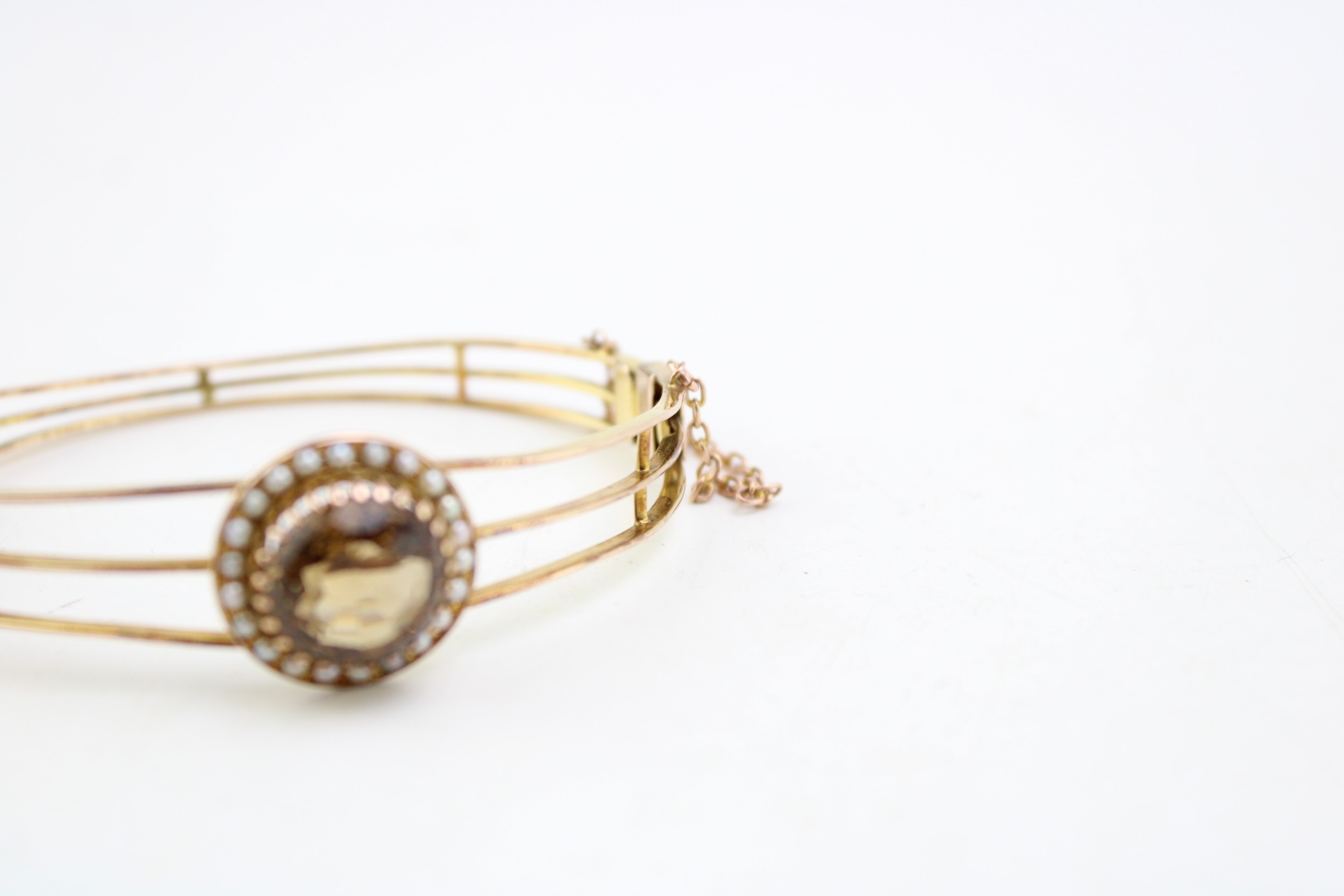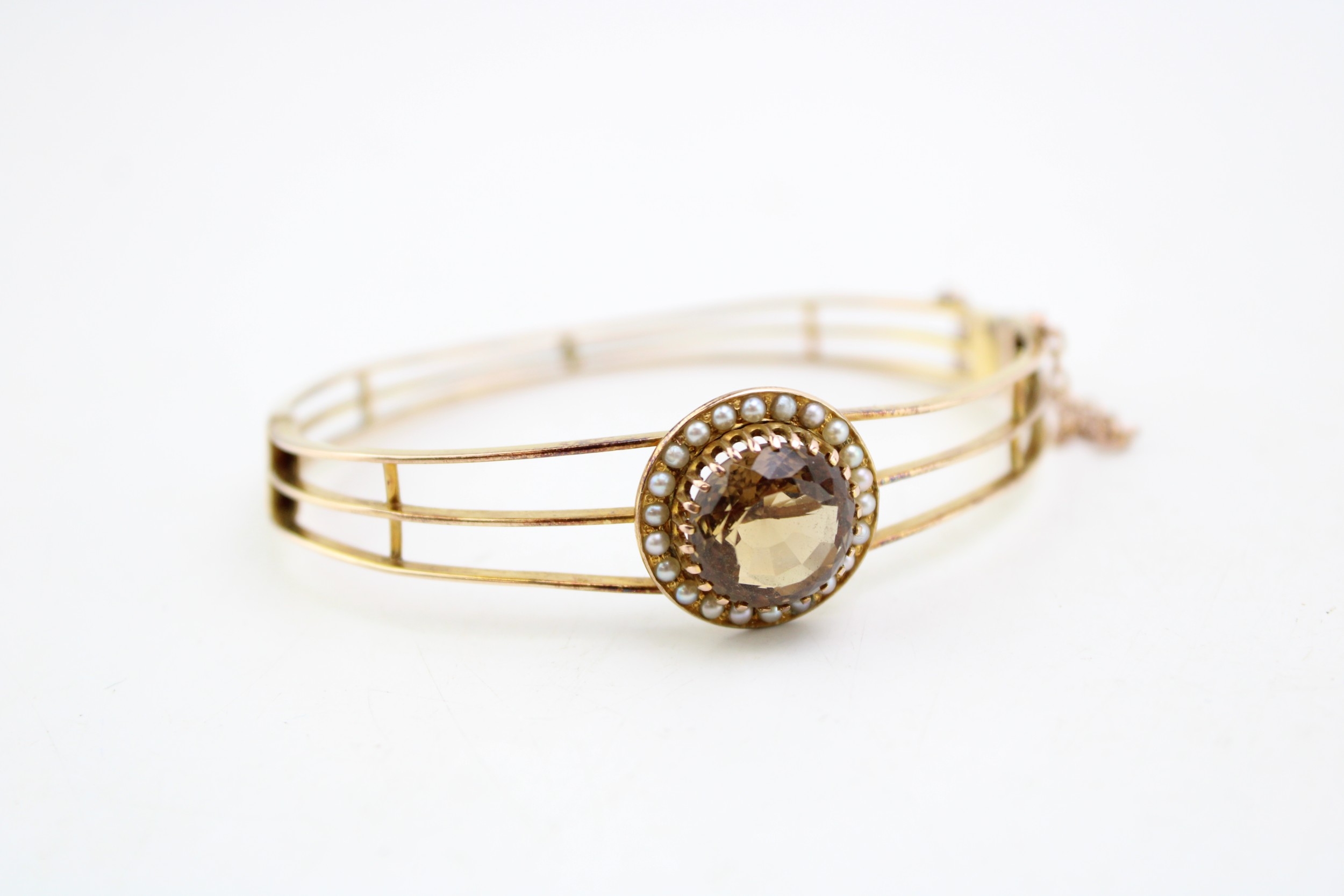 An Art Deco, gold, citrine and pearl set bangle, the citrine of approximately 18.3mm, encircled by a band of seed pearls on an open triple bar form hinged bangle, apparently unmarked but testing as 14ct gold. internal diameter 65.1 by 56.9mm, 14.2g.