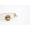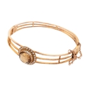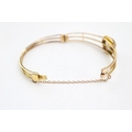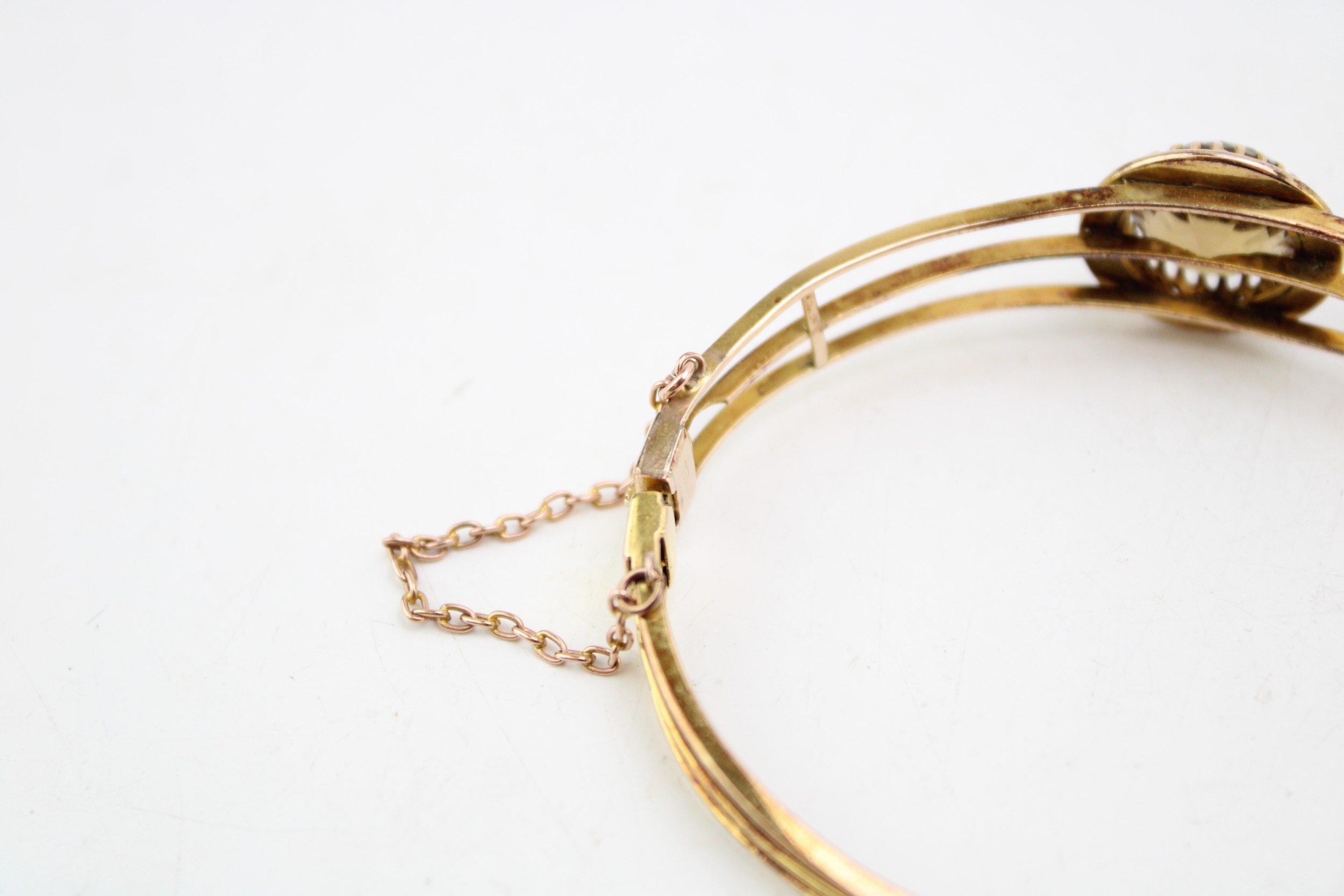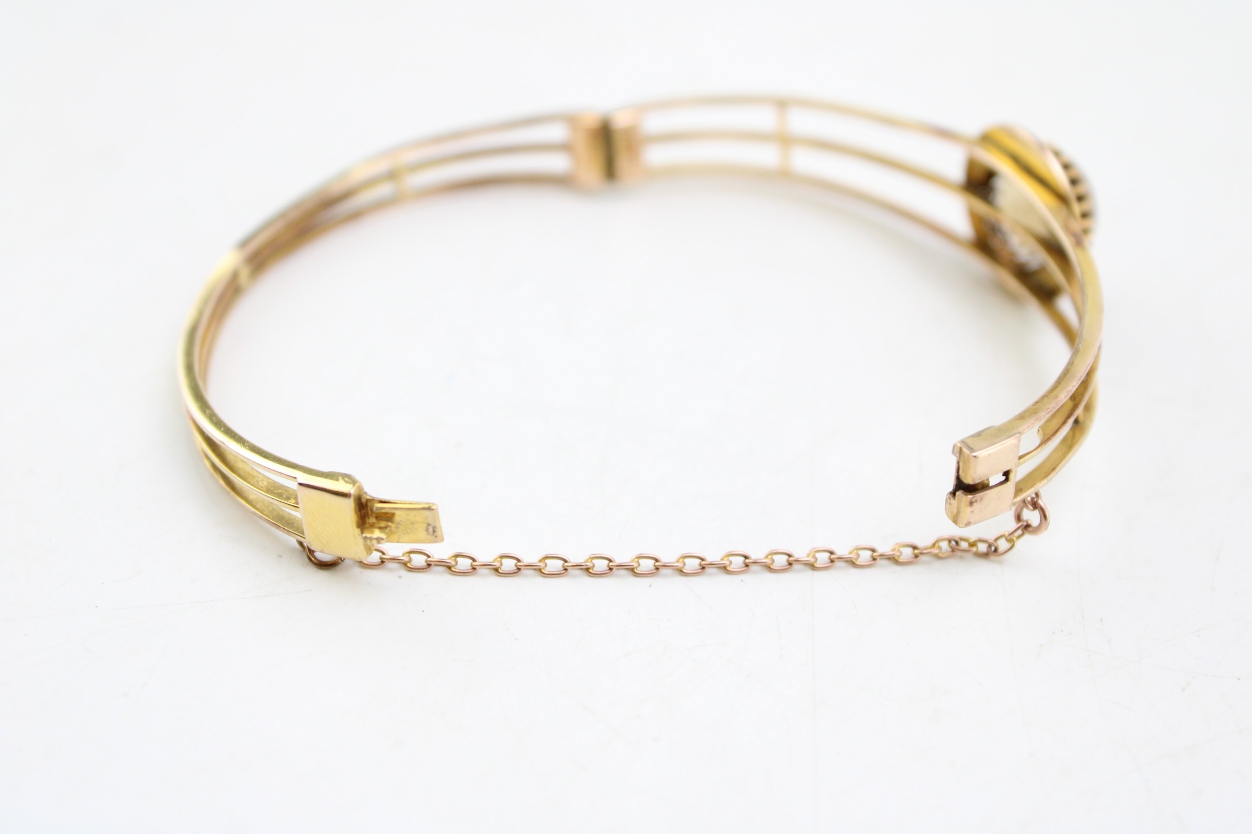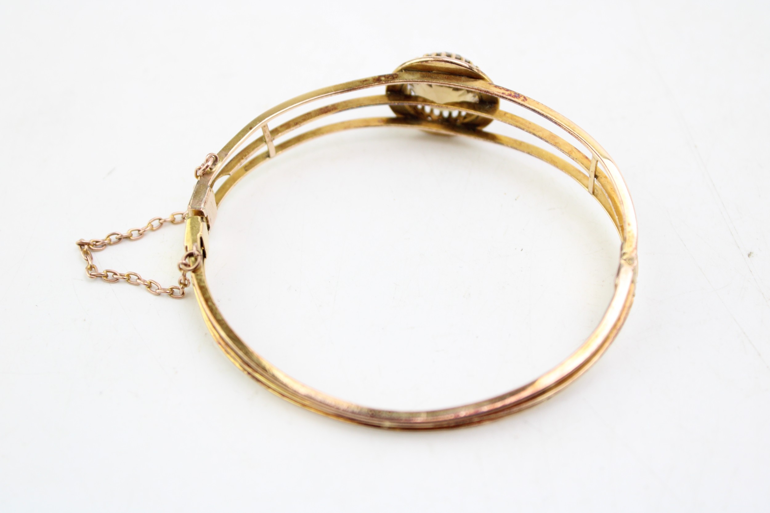 An Art Deco, gold, citrine and pearl set bangle, the citrine of approximately 18.3mm, encircled by a band of seed pearls on an open triple bar form hinged bangle, apparently unmarked but testing as 14ct gold. internal diameter 65.1 by 56.9mm, 14.2g.