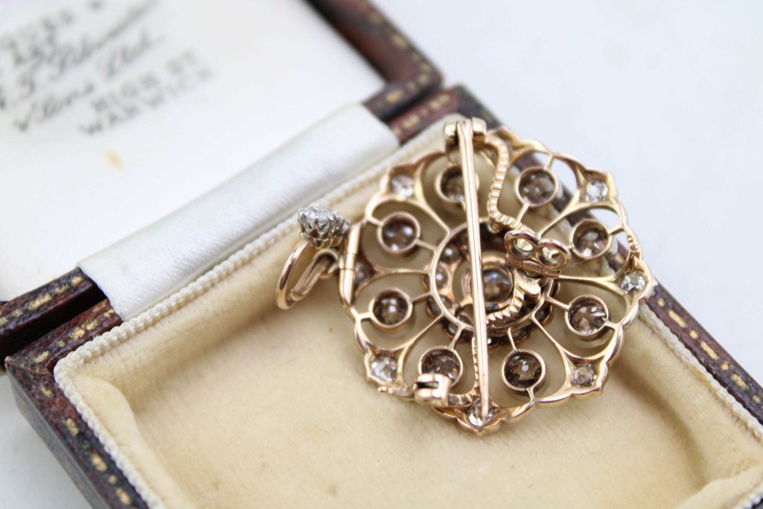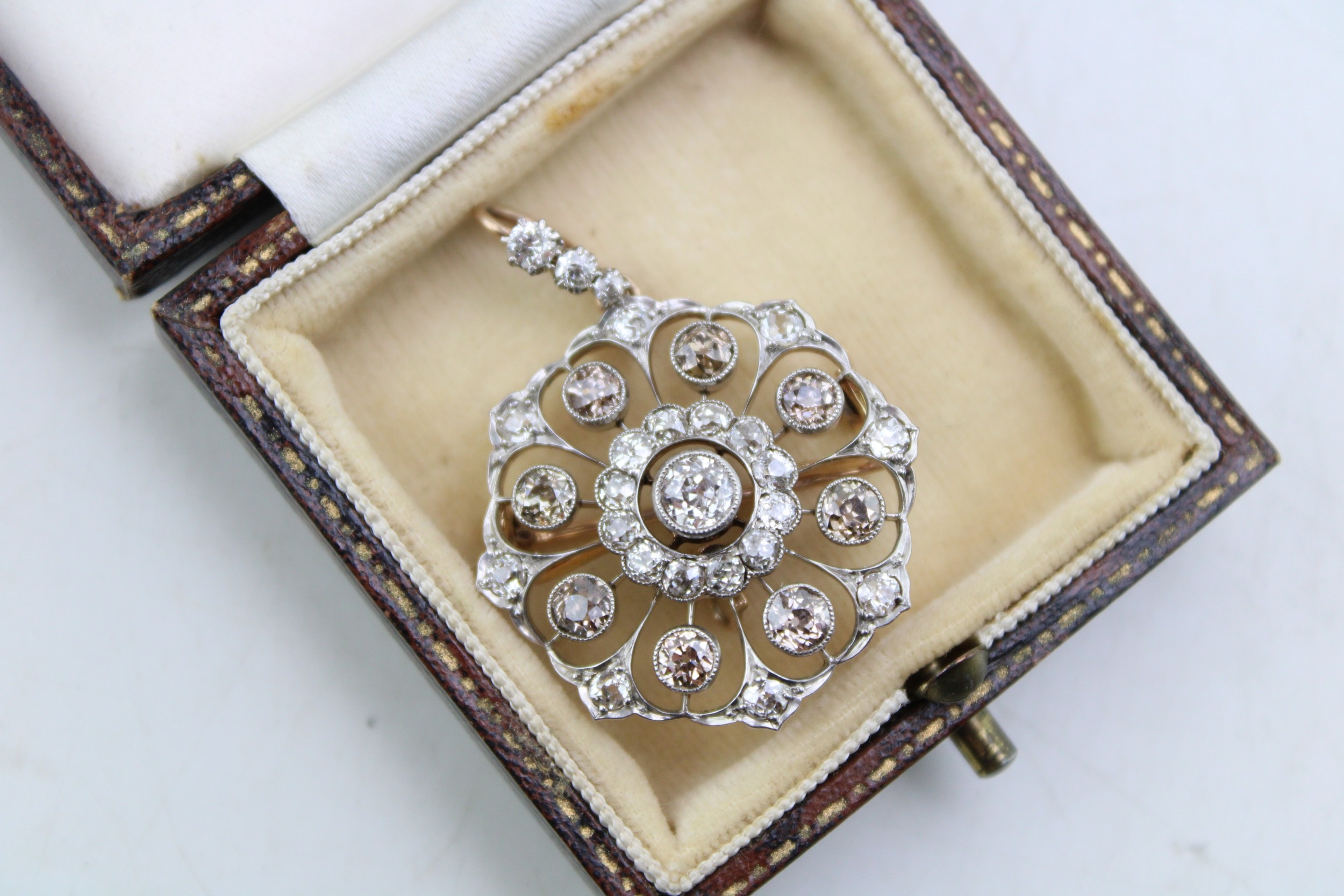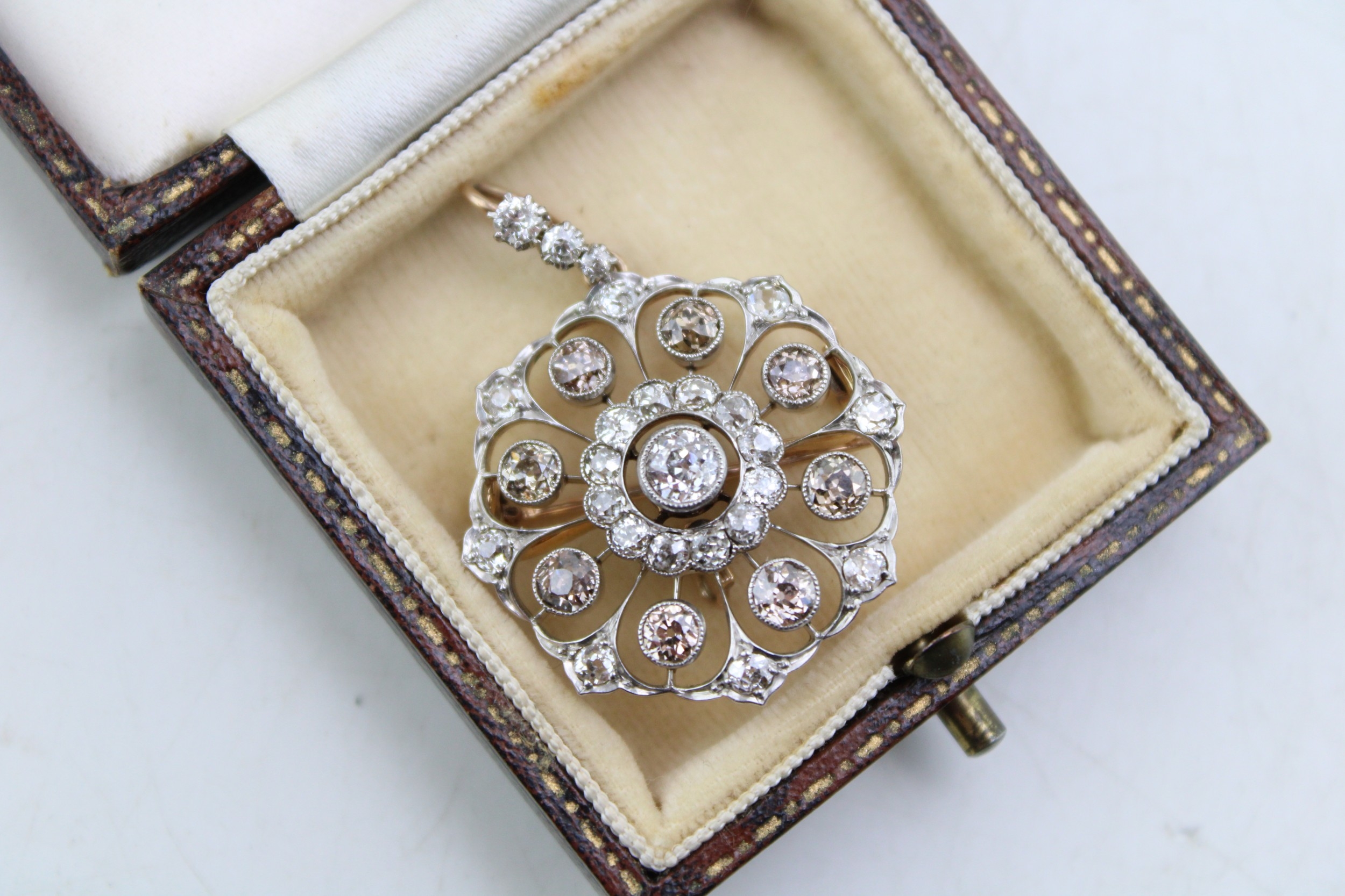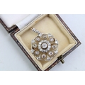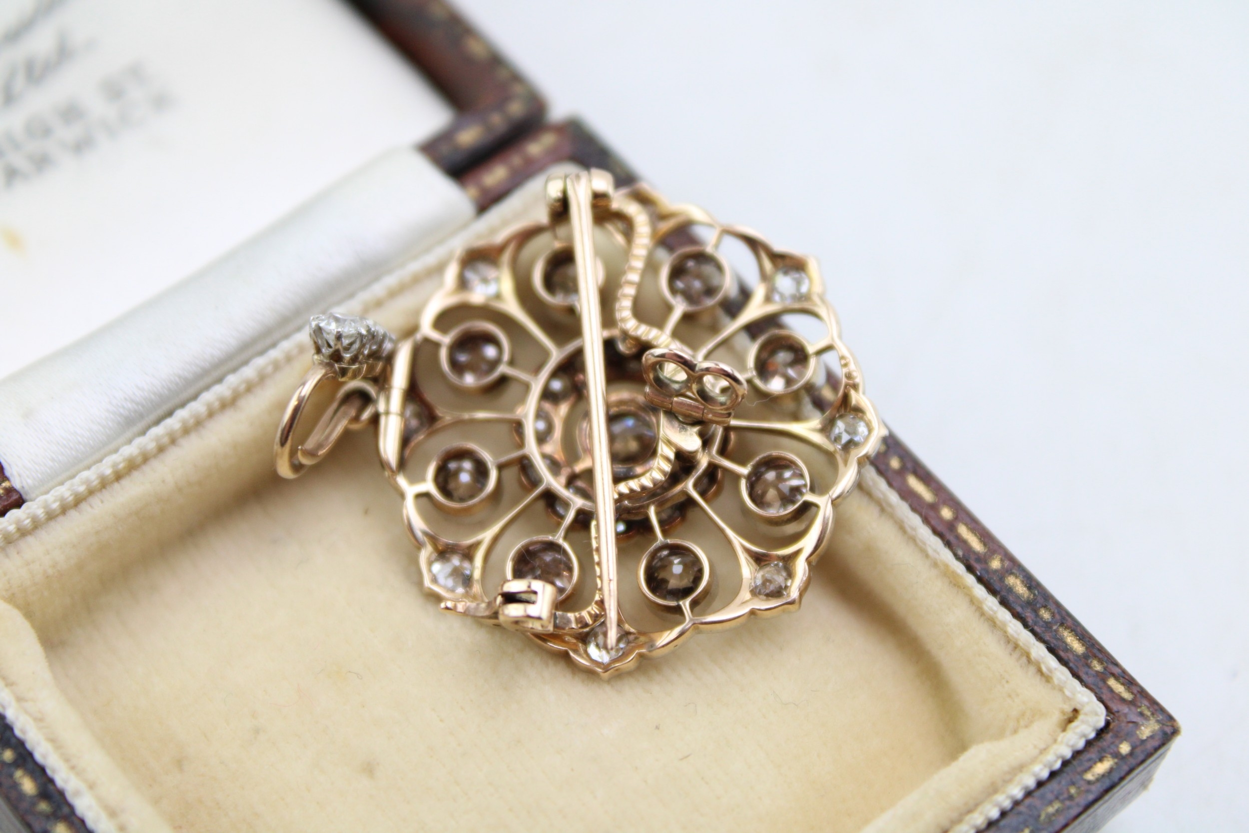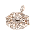 An Art Nouveau diamond set metamorphic pendant brooch, with central diamond of approximately 4.5mm diameter, bordered by twelve smaller diamonds, with a further eight diamond petals of slightly darker hue, within an diamond set ogee frame, and three further diamonds to the removable bale, with detachable brooch back, metal appears unmarked but testing as platinum to the front with gold back, 28 by 39mm including bale, total weight including brooch back 7.7g.